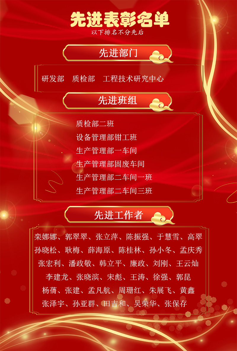 為表彰先進(jìn),樹立楷模,1月24日下午,公司2021年度先進(jìn)表彰儀式在研發(fā)中心會(huì)議室隆重舉行,儀式現(xiàn)場(chǎng)對(duì)先進(jìn)工作者、先進(jìn)班組、先進(jìn)部門進(jìn)行表彰嘉獎(jiǎng)。公司董事長(zhǎng)、總經(jīng)理張新功,公司各級(jí)經(jīng)營(yíng)管理干部及先進(jìn)工作者、先進(jìn)班組及部門代表參加了儀式。
